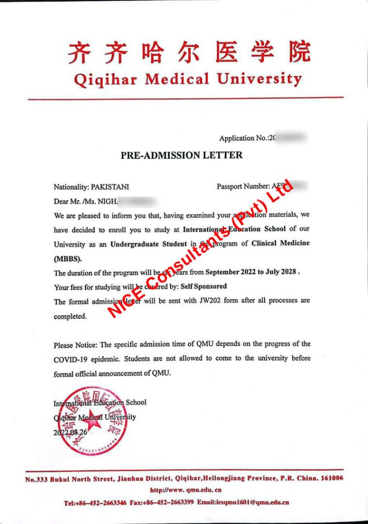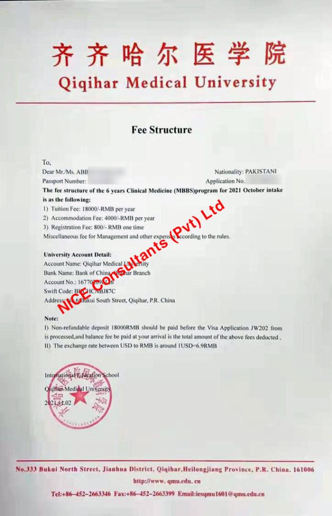 Qiqihar Medical University admission opened for March/Sep 2024, Apply at NICE Consultants (Pvt) Ltd., for MBBS in Qiqihar Medical University. Tuition Fee of 18000 RMB Yearly,  Click
